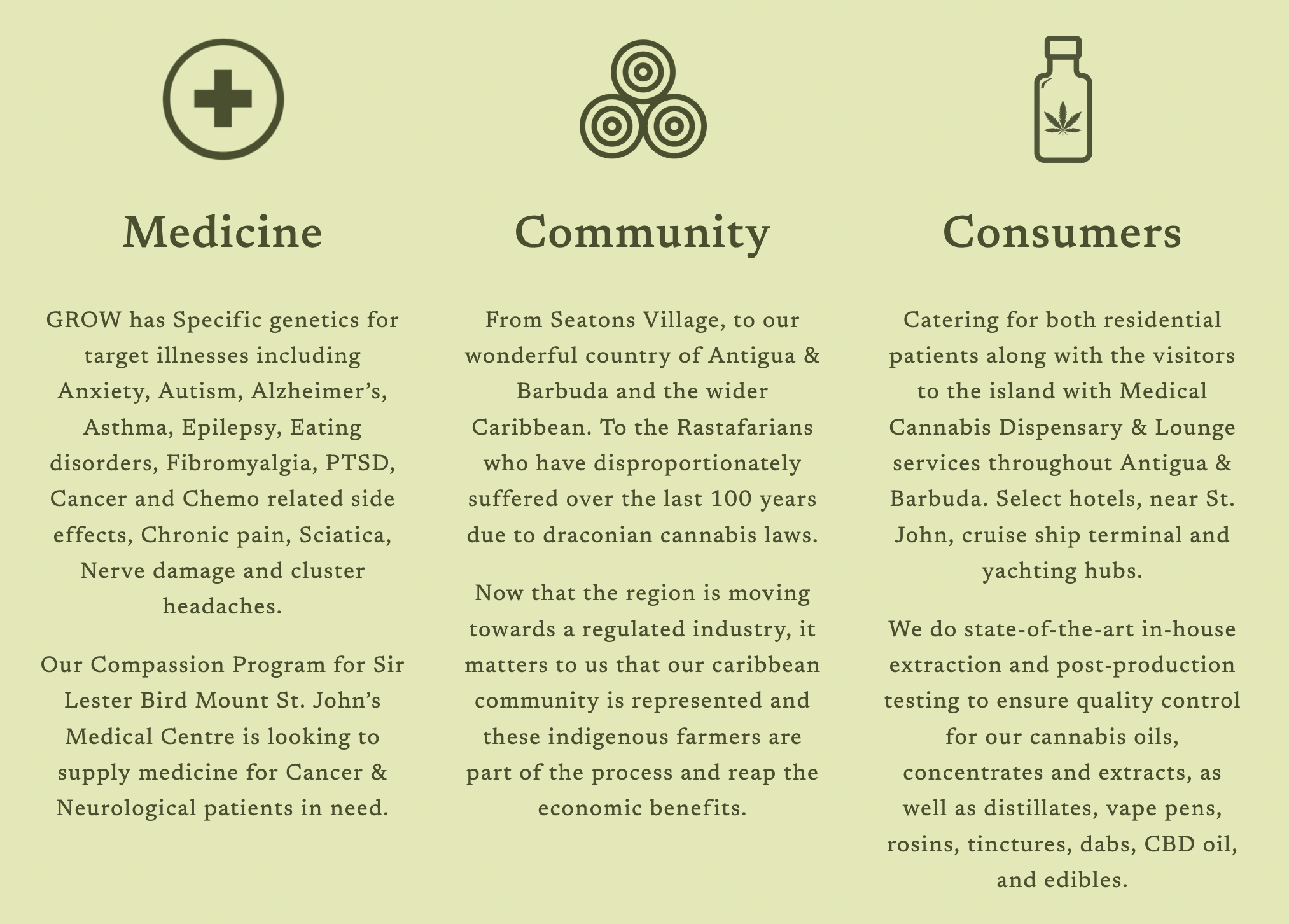 GROW (Antigua & Barbuda) Limited is an Antiguan & Barbudan registered vertically integrated seed to sale Medical Cannabis Company. We are a unique calibration and a first for the Cannabis industry. We are a partnership of Private, Rastafari and Public ownership.